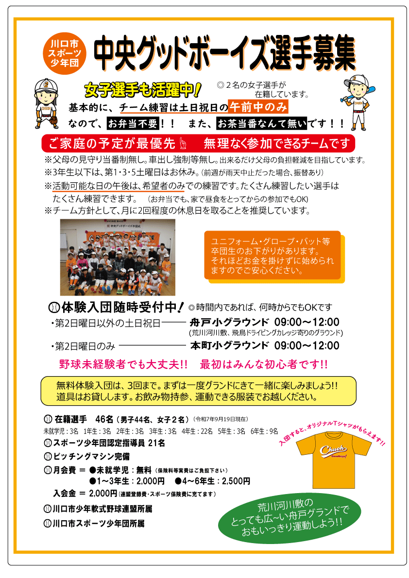 中央グッドボーイズでは、いつでも新メンバーを募集しています。体験入団も随時受付していますので、是非一度グラウンドにお越しください。 選手募集しています!! 募集対象 未就学児~小学6年生 ※学区は問いません お気軽に連絡ください!! お問い合わせ 見学・体験入団について 随時、見学・体験入団受付しております。直接グラウンドに来ていただいてもOKですが、遠征等や休息日等で、グラウンドでの活動が無い場合がございますので、お越しの際は連絡頂ければ幸いです。